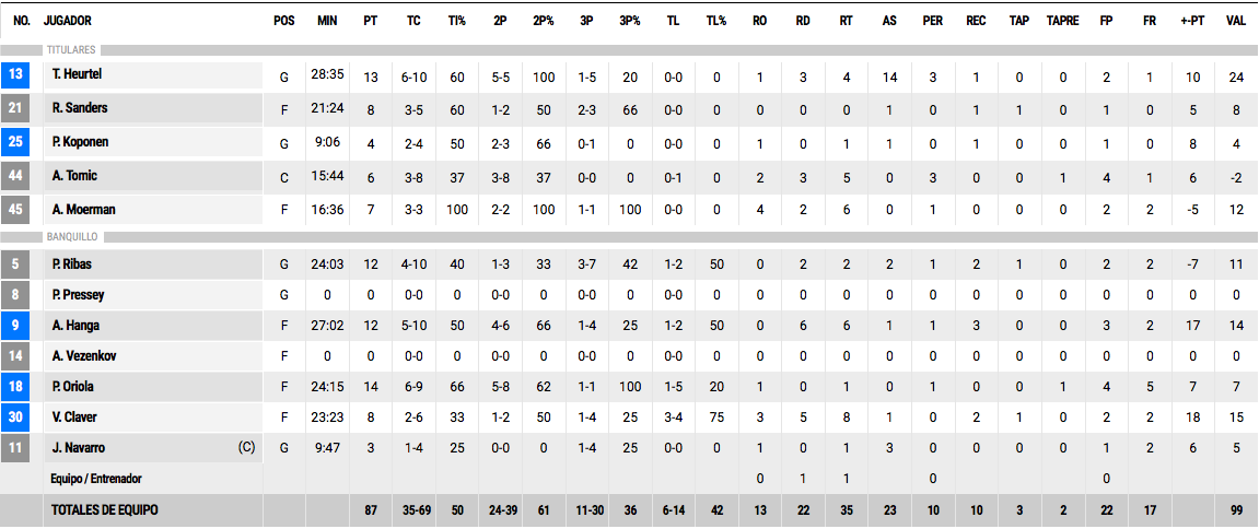 Heurtel: Se jugó a lo que diseñó Pesic, que fue maravillosamente plasmado por Heurtel en la pista. El base francés, con catorce asistencias y fue el auténtico dominador del partido. Ninguno de los tres bases amarillos pudo frenarlo y, hasta el final, estuvo creando ventajas y espacios para sus compañeros. Con sencillos pick and roll, en la cabecera, Heurtel encontraba camino libre para asistir a las alas o a los pívots bajo canasta. Su primera opción siempre era buscar a un compañero y lo de anotar fue secundario.