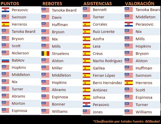 A continuación os dejamos el cuadro con los jugadores más destacados de la temporada en base a los totales de anotación, rebotes, asistencia y valoración. Destaca el dominio de los jugadores estadounidenses en todos los aspectos salvo en la faceta de asistencias, algo que se explica por el hecho de las limitaciones de cupos y extracomunitarios en la época. En el puesto de base vemos a jugadores históricos del baloncesto nacional como Azofra, Creus, Nacho, Antúnez, Corrales copando un top de asistencias con claro sabor español en un contexto en el que los clubes apostaban casi siempre por norteamericanos interiores.