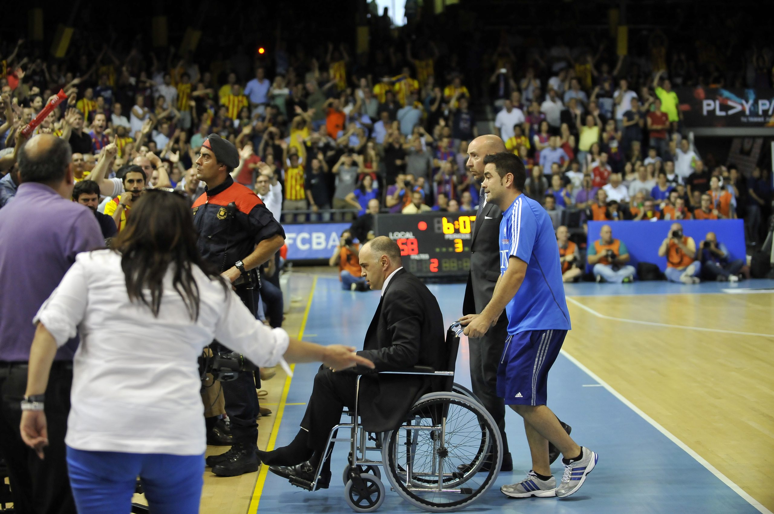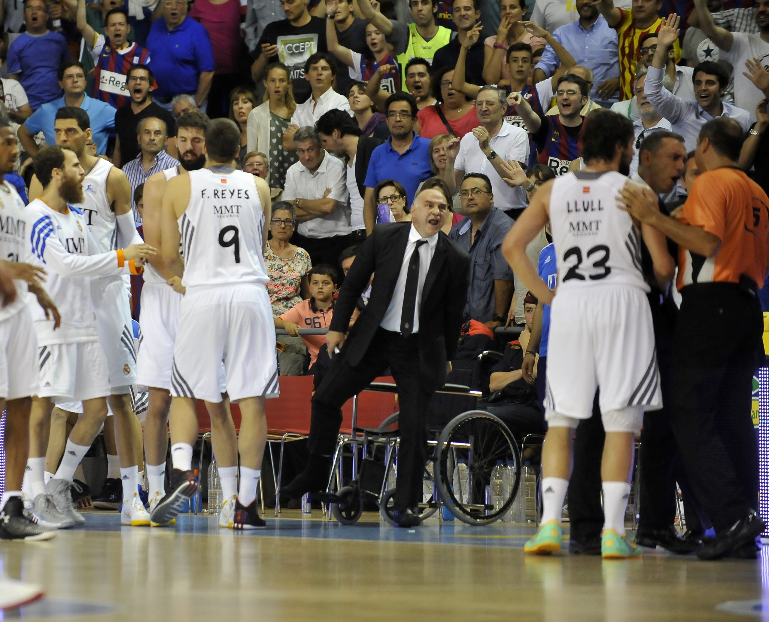 La batalla continuó endureciéndose tras el descanso con el Real Madrid muy concentrando colocándose a dos puntos tras acciones de Bouroussis y Darden, que devolvió con un dos más uno, un mate de Papanikolau por línea de fondo. Nachbar con un triple hacía ganar metros a los catalanes y aunque Bouroussis seguía haciendo daño cerca de las trincheras azulgranas, los de Pascual se distanciaban con una canasta de Tomic. Por si hubiesen sido poco las dos técnicas de la primera parte, los árbitros descalificaron a Pablo Laso por sus reiteradas protestadas lo que dejó para el recuerdo una de las imágenes de la final: el técnico del Real Madrid abandonando en silla de ruedas el parquet camino a los vestuarios. Ya sin el general blanco al frente el Barça logró una renta de 12 puntos que acercaba el triunfo al bando local. Los madridistas luchaban contra la dinámica y aunque Navarro tiró de galones para devolver los 10 puntos de ventaja, al final del tercer cuarto se llegó con 65-57 tras dos tiros libres de Carroll.