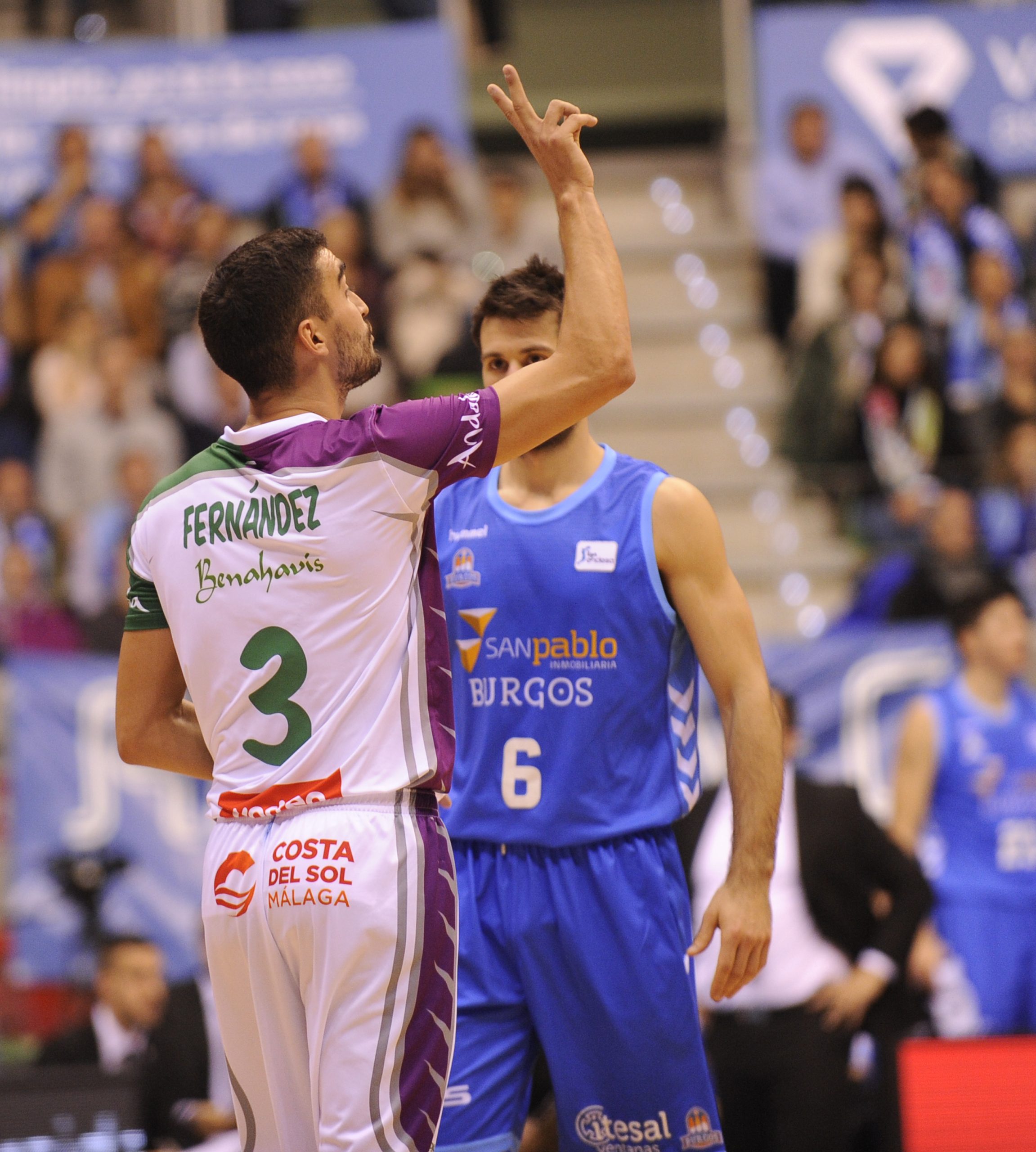 En el segundo cuarto Brendan Frazier continuó tomando la batuta del ataque local. El triple decidía y toda la fortuna caía del lado burgalés mientras Bruno Fitipaldo se unía a la fiesta. Al final, el base uruguayo acabó regalando todo un repertorio de triples imposibles y en oposición muy importantes para los suyos. La resistencia por parte de Unicaja tenía ya nombre y apellidos: Jaime Fernández. El madrileño ejerció de base y de jugador total para marcar el ritmo de los suyos. Las ventajas se iban reduciendo ante el ritmo de Unicaja que dependía de los chispazos de sus exteriores más allá de realizar un juego regular. Sin embargo, las tornas se igualaban en un marcador mucho más justo para los malagueños: 38-37 al término de la primera mitad.