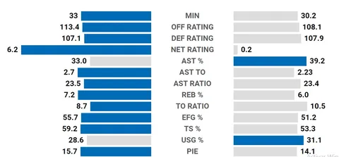 Pero las similitudes son varias. Mientras que Kyrie tiene un ratio neto mucho más alto (+6.2 frente a 0.2), una mayor efectividad en el tiro (48.7% FG frente a 43.4%) y es más solvente defensivamente y en el rebote, al mismo tiempo que intenta y acierta más tiros libres (3.2 frente a 2) y más tiros en la pintura, no hay que desestimar a Russell. El más joven de los dos es un base en crecimiento, sin estar todavía al nivel de Irving, que mejorará a los Nets en bastantes facetas. Sin embargo, temas como la organización (ambos han rondado las 7 asistencias y el 23.5% de ratio de asistencias este año) quedan más que cerrados.