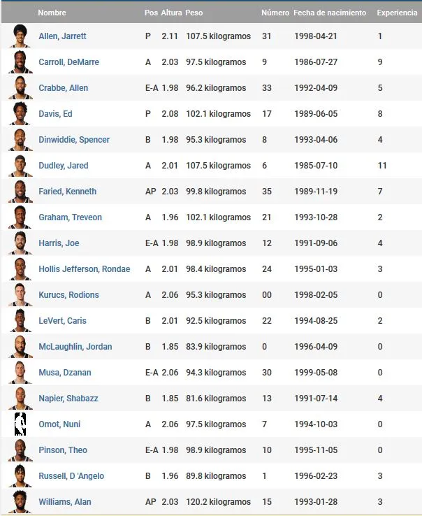 Top-3 salarios de la plantilla: Dwight Howard (18,9 X 1, cortado), Allen Crabbe (37 X 2), DeMarre Carroll (15,5 X 1).