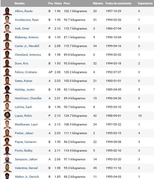 Top 3 salarios: Jabari Parker (20 millones y opción de equipo para la próxima temporada por la misma cantidad de dinero), Zach Lavine (19,5 millones y contrato por el mismo monto hasta la temporada 2021/22) y Robin López (14,3 millones y acaba contrato esta temporada).