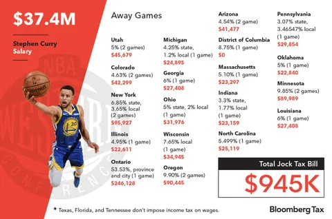 Y es por ello que contamos con un gran abanico de posibilidades. Desde el 13.3% que deben pagar los residentes de California -Stephen Curry siempre es líder en esta clasificación- hasta el 0% que disfrutan en Texas, Florida y Tennesee. Y que disfrutarían en Las Vegas o Washington -los Sonics- si contaran también con una franquicia. Los Estados más cercanos a California -con equipo NBA- son New York, Oregon, Minnesota, el Distrito de Columbia y Wisconsin, con un 10% los primeros 3, un 9% los integrantes de los Wizards y un 8% Giannis y compañía. Los Estados que menos pierden, pero pierden, son Indiana y Pennsilvania, con un 3% únicamente de tasas estatales. Y, en tercera posición, los que se encuentran a medio camino, entre el 4 y el 7%, que son Georgia, Louisiana, Colorado, Utah, Ohio, North Carolina, Massachusetts, Michigan, Illinois y Oklahoma.