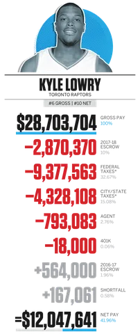 Stephen Curry cuenta este año con unos “earnings” de 40,2 millones aproximadamente, cifra que baja un 53%, siendo los 19,05M un 47% aproximado de su contrato inicial. LeBron James, en su caso, pierde también un 53%, pasando de los 37,44 que recibe por parte de los Lakers a los 17,66 que acaban entrando en su banco. Curiosamente, los dos que más bajan por culpa de los dos impuestos comparten los impuestos de California, una muestra clara de causa/efecto. Y, por acabar este trío de ases, de California nos vamos a Toronto, donde Kyle Lowry desciende de sus 35 millones a los 16.26 que le quedan tras impuestos. Es decir, se queda con un 46%.