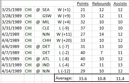 Tras filtrear con las cifras mágicas de los dobles dígitos en tres apartados del juego durante unos cuantos partidos más, el 25 de marzo de 1989 daría comienzo a la espectacular racha que ha pasado a la posteridad. Iniciaría escribiendo la historia de este hito ante los Sonics, en una ajustada victoria por 110-111, en la que sumaría 21 puntos, 12 rebotes, 12 rebotes, con Graig Hodges sumando 23 tantos y Scottie Pippen otros 31 puntos. Durante esa racha, Jordan promediaría unos extraterrestres 33.6 puntos, 10.8 rebotes y 11.4 asistencias. A lo largo de esa temporada 1988-1989, "su Majestad del Aire" sumaría la mitad de los triples-dobles logrados a lo largo de su larga carrera (14 de 28).