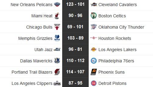 LA PAREJA COUSINS-DAVIS LIDERA EL TRIUNFO DE PELICANS ANTE CLEVELAND Convincente victoria de Pelicans ante unos Cavs que suman su tercera derrota en los últimos cuatro encuentros. La pareja interior de Pelicans fue una pesadilla para Cleveland. Cousins (29p, 12r, 10a) y Davis (30p, 14r) dominaban la pintura, y además estuvieron acompañados por un gran Holiday (29p, 7a). Love (26p, 11r) y James (18p, 8a) no fueron suficientes para doblegar a unos Pelicans que fueron por delante durante la mayor parte del partido.