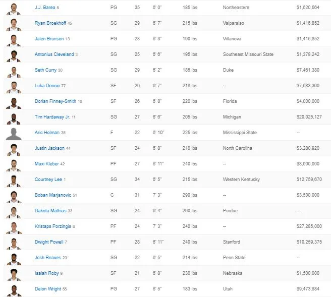Los Dallas Mavericks tienen comprometidos para la próxima temporada 110 millones de dólares en contratos, contando con que Hardawy Jr. se acogerá a su opción de jugador. Muchos jugadores de rol que deberán demostrar un buen rendimiento para justificar sus contratos.