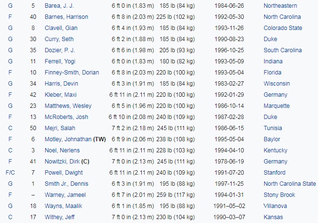 Futuro – 2017/18. Si jugaran en la Conferencia Este, no se descartaría que pisaran los playoffs. Pero en el Oeste las cosas son bien distintas. La conferencia está más salvaje que nunca y las plazas por entrar en playoffs llevaban tiempo sin estar tan caras. Un año más, y ya van veinte, volverán a contar con el incombustible Dirk Nowitzki, que aportará experiencia y liderazgo, un liderazgo que poco a poco deberá ir asumiendo la que se presupone su estrella: Harrison Barnes. El Halcón Negro aportó 19'2 puntos y 5'1 rebotes el curso pasado, y este año también se espera que sea el referente en ataque. Wesley Matthews y Seth Curry deberían ser piezas importantes en un perímetro, que cerrará -a priori- el novato Dennis Smith. Otro que deberá ser importante, y cuyo futuro todavía no está del todo claro (este verano se convertirá en agente libre), es Nerlens Noel. De su rendimiento dependerá en buena parte la posición que ocupen a final de temporada los hombres de Carlisle.