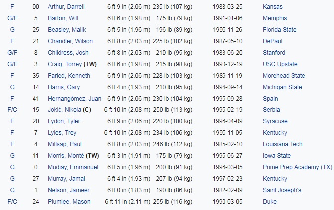 - Nikola Jokic. Fue el sorpresón de la temporada pasada. La sonrisa en todos los aficionados al baloncesto. Estandarte del nuevo baloncesto: tipo muy alto, que se mueve bien por la zona atacante, con buen lanzamiento exterior y con una enorme visión de juego. Sin Nurkic se afianzó en un liderato que se ha ganado con creces acabando el curso con 16'7 puntos, 9'8 rebotes, 4'9 asistencias y 0'8 tapones en 27 minutos de media. Estará bien aconsejado por su nuevo compañero Paul Millsap.