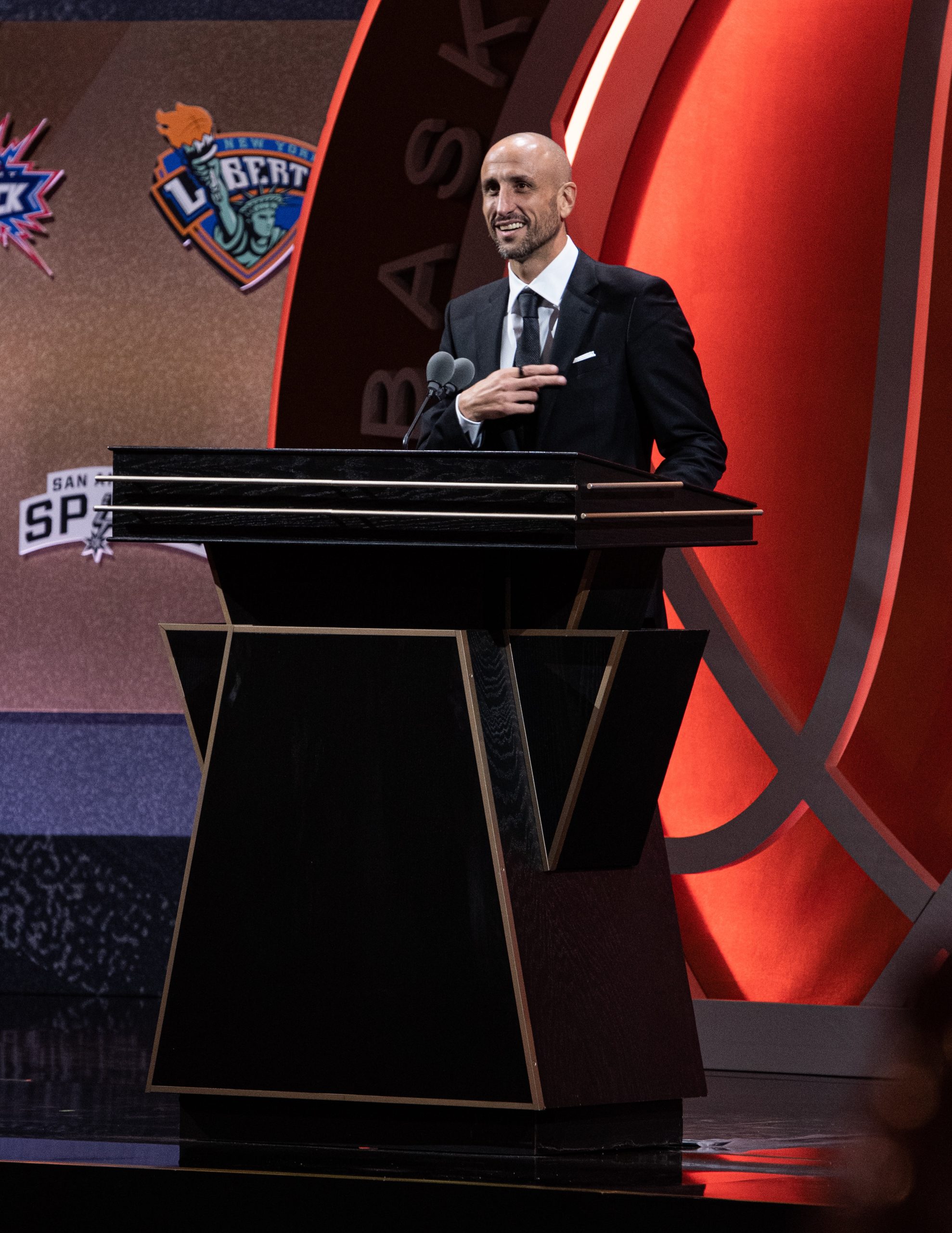 Emanuel ‘Manu’ David Ginóbili fue presentado e introducido por Tim Duncan, miembro también del Hall of Fame. El jugador argentino de Bahía Blanca pasó toda su carrera NBA en los San Antonio Spurs, formando un Big Three para la historia junto al mismo Duncan y el base francés Tony Parker, que podrá ser miembro por primera vez si lo eligen en la próxima selección.