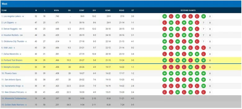 En la madrugada de ayer ganaron Blazers, Spurs y Suns, mientras que los Grizzlies volvieron a perder, con lo que se contrajo aún más la clasificación para el octavo y noveno puesto. Ahora mismo, Portland es octavo y Memphis es noveno, a medio partido de los Blazers. Con el mismo balance que los Grizzlies están Suns y Spurs, pero por debajo de los de Tennessee, puesto que han jugado menos partidos, de modo que su porcentaje de victorias es ligeramente inferior. Las posibilidades de cada equipo son las siguientes: