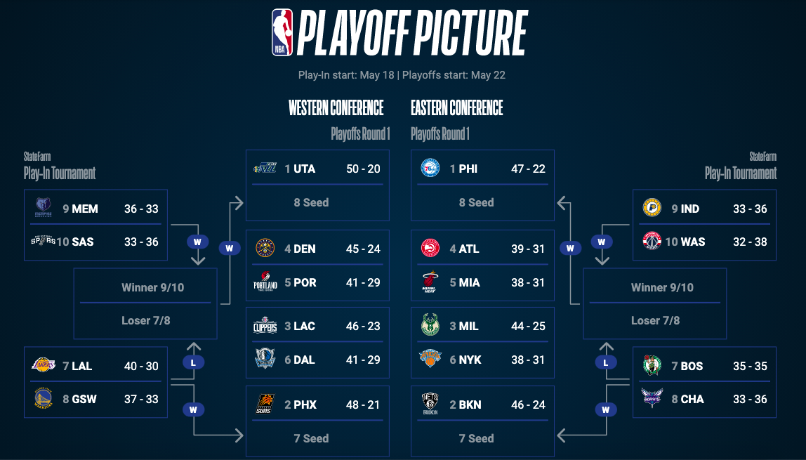 En el play-in veremos tres eliminatorias por conferencia, pero no serán a modo de semifinales o final ni enfrentarán a mejores ni peores en este enrevesado torneo. 7º y 8º jugarán en casa del 7º y el ganador pasará a playoffs con el seed 7. Por otro lado, 9º y 10º jugarán en casa del 9º y el perdedor quedará eliminado. La tercera eliminatoria se dará entre el perdedor del duelo 7º-8 y el ganador del 9º-10º, en la cancha de los primeros. El ganador pasará a playoffs con el seed 8 y el perdedor verá las eliminatorias por televisión.