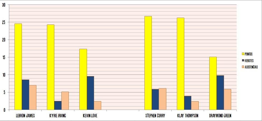 La igualdad reina entre las primeras espadas de ambos equipos. LeBron e Irving anotan prácticamente lo mismo (24,6-24,3), al igual que los Splash Brothers (26,7-26'2), mientras que Love anota más de 17 puntos por partido por los 11 de Green, algo que el ala-pívot de los Warriors compensa con su faceta de All-Around Player. Los 66 puntos del Big-Three de los Cavs, por los 63'9 puntos del de Warriors denotan una mayor necesidad para sus equipos, al menos en cuanto a anotación, pero no en sensaciones. Ya que es díficil encontrar un partido malo de los tres de los Cavaliers, sólo el primer partido de la Final del Este en Toronto, mientras que, este año, Green, Thompson y Curry sí que han mantenido una irregularidad latente en la eliminatoria ante los Thunder.