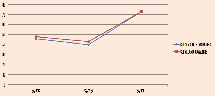 El dato curioso viene en forma de paradoja, ya que dos equipos con semenjante fuerza desde la línea de tres puntos, son dos de los equipos que peores porcentajes desde la línea de tiros libres atesoran. Ambos un mejorable 73%. Está claro, hombres como Bogut, Iguodala o Draymond Green en los Warriors, o Tristan Thompson, JR Smith o LeBron James en los Cavs, penalizan a sus equipos.