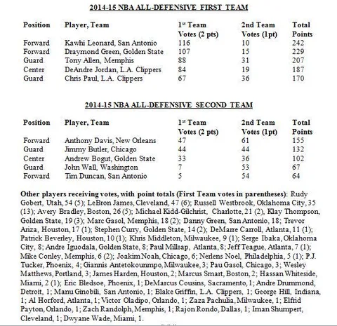 Kawhi Leonard, premiado con el galardón a Mejor Jugador Defensivo del año, ha sido el jugador más votado para el primer equipo (116 votos) por los periodistas. Le sigue Draymond Green, su mayor competidor en el galardón individual, acumulando hasta 107 votos para el primer equipo. Tony Allen logra su 3º presencia en un All-Defensive 1st Team en su carrera, y el quinteto lo completan dos jugadores claves en los Clippers: Chris Paul, catalogado como uno de los mejores bases defensivos de la liga, y DeAndre Jordan. Este último, agente libre sin restricciones este verano y que, posiblemente, se acabe embolsando un jugoso nuevo contrato.