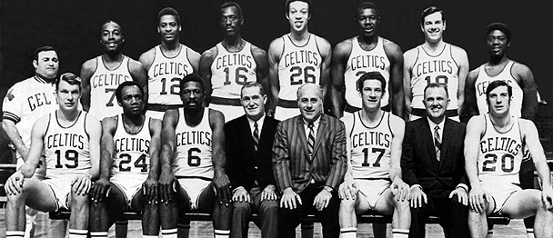 En los años 50 y 60, época de uniformes con diseños simples y números y letras muy básicos, nos topamos con dos de los uniformes más míticos de la NBA, luchando por la gloria en una rivalidad que perdura por las décadas. Hablo de Los Ángeles Lakers y de los Boston Celtics. Y es llamativo, porque en el caso de los célticos su jersey “apenas” ha cambiado respecto al diseño y se mantiene fiel al estilo que les hizo dominar la liga con el gran Bill Rusell al frente en la época dorada de “Red” Auerbach. Salvo en excepciones como el jersey con letras doradas del día de San Patricio que usan desde el 2006 como uniforme alternativo, y otro con leyenda y motivos italianos que lucieron en el Tour Europeo en Roma (2007), los Celtics nunca han roto con el estilo sobrio que les caracteriza y menos con su mítico verde, que engalanó a Larry Bird en su día.