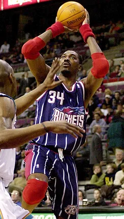Después del campeonato del 94 los Houston Rockets cambiaron su uniforme (1995-2003) adoptando uno de los más horrorosos que recuerdo. Rayas anchas, el logo del gigantesco del cohete… y por si fuera poco, han seguido en barrena con el uniforme posterior. ¿Dónde quedaría el sencillo pero efectivo uniforme con el que Hakeem “The Dream” Olajuwon nos obsequiaba con sus pasos de ballet.