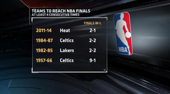 - Junto a Los Angeles Lakers y Boston Celtics, Miami Heat es la tercera franquicia de la historia en conseguir llegar 4 veces consecutivas a las Finales de la NBA.