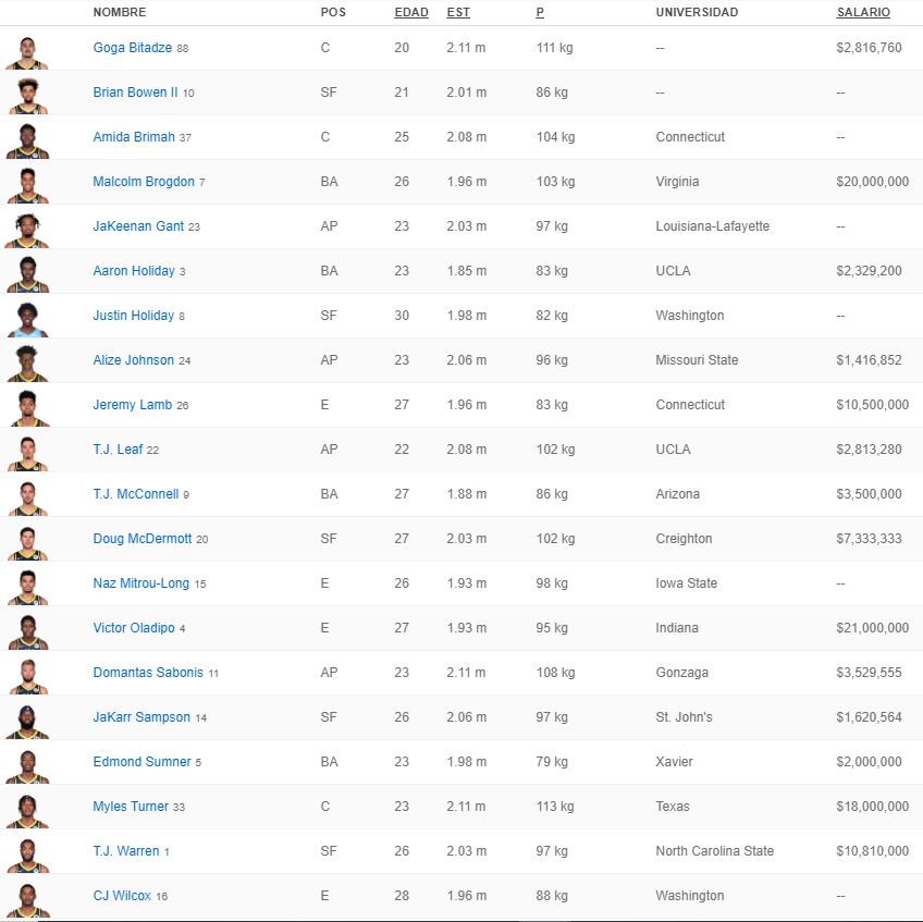 Indiana gasta 118 millones en salarios, por encima del límite salarial pero por debajo del impuesto de lujo. Su situación está bastante comprometida para los próximos años, dado que este año ha incorporado a jugadores que vienen con contratos a medio plazo. El año que viene se gastarán 106 millones, pero tienen pendiente la renovación de Domantas Sabonis, que pedirá un salario acorde a su rendimiento, que puede dispararse este año. Intentarán deshacerse de Doug McDermott (14,6/2), su único contrato inflado que les puede estorbar de cara a la temporada que viene.