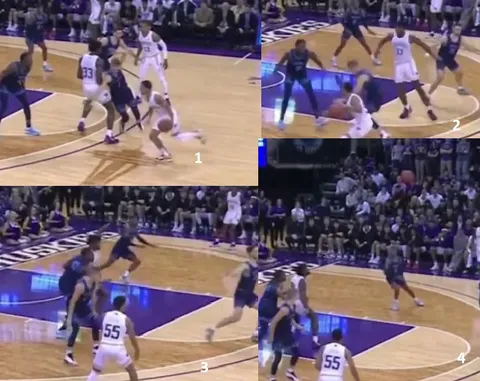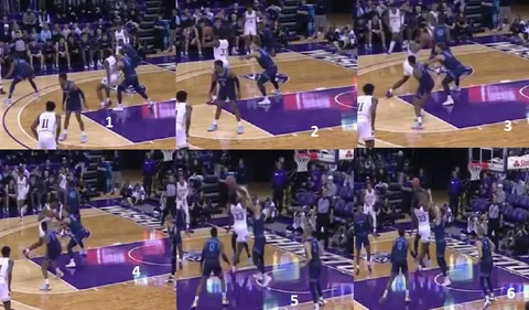 Aquí vemos unas imágenes cortando una situación que refleja este problema. En la imagen 1 gana bien la posición (no lo tomaremos como algo referencial debido a la ventaja física que tiene), en la 2, 3 y 4 se gira para atacar el aro (otra gran cualidad que tiene, como veremos), en la 5 y 6, por último, vemos cómo su toque final para subir el balón no es el óptimo.