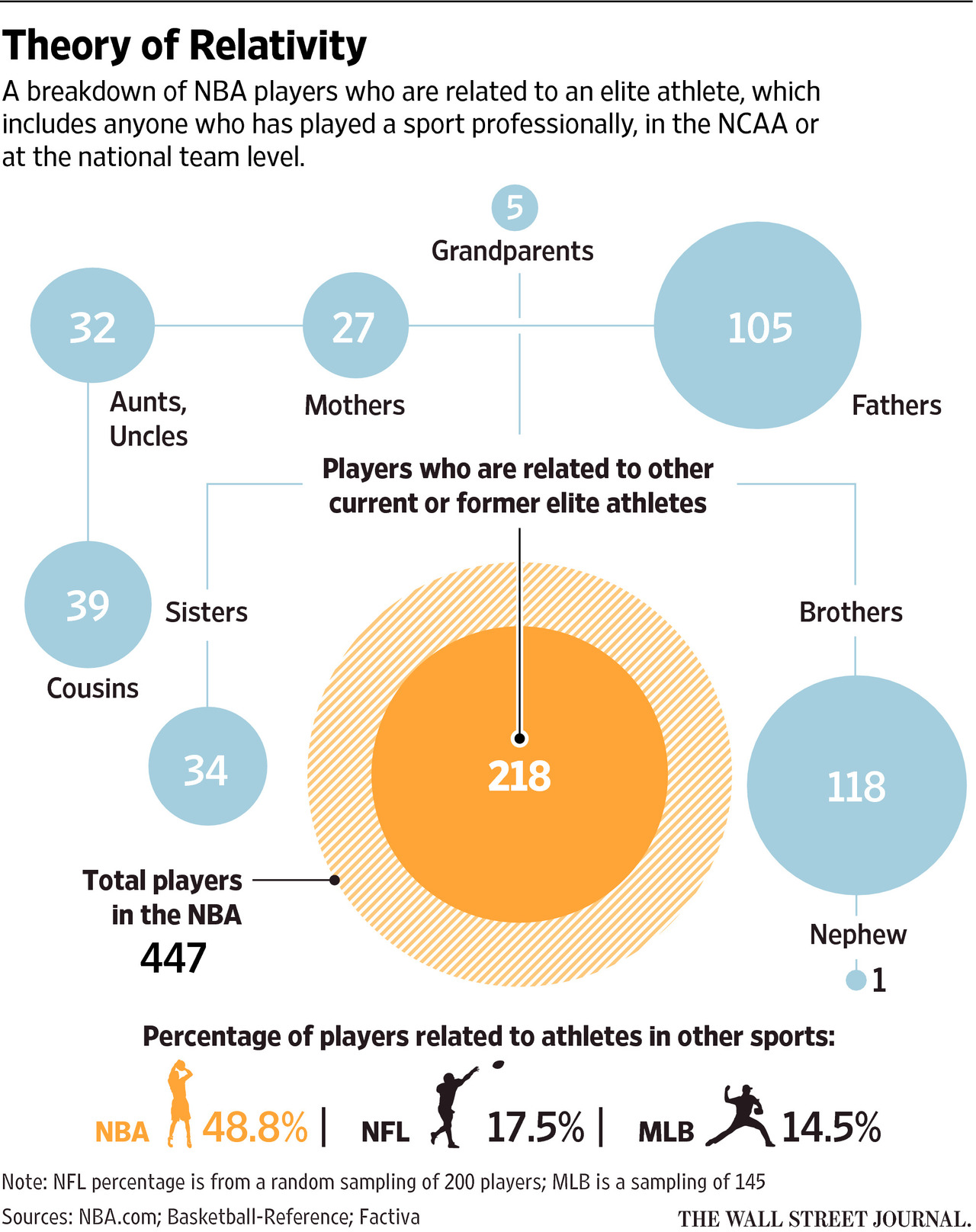 Un estudio del Wall Street Journal ha puesto de relieve que jugar en la NBA es una cuestión de familia. Tras analizar la biografía y el árbol genealógico de todos los jugadores que componen la liga, este medio de comunicación ha comprobado que nada menos que el 48.8% están relacionados familiarmente con deportistas o ex deportistas de elite. Un porcentaje mucho mayor que en otras ligas del deporte profesional norteamericano, como la NFL (17.5%) o la MLB (14.5%).