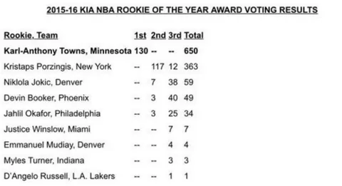 La NBA ha anunciado de manera oficial que Karl-Anthony Towns (15/11/1995), pivot de los Minnesota Timberwolves, ha sido designado como "Rookie of the Year" tras haber superado en la votación a Kristaps Porzingis (Knicks) y Nikola Jokic (Nuggets). Como contamos en nuestro Top 10 de rookies de la temporada, Towns ha liderado a una de las mejores camadas de los últimos años. Al igual que el MVP de la temporada regular, Stephen Curry, Towns ha sido elegido como mejor Rookie de forma unánime, lo que da más valor aun a este reconocimiento.