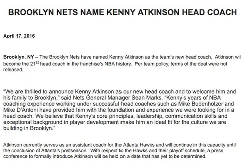 Atkinson tendrá su primera experiencia como entrenador jefe en un banquillo NBA. Hasta ahora ha ejercicido de ayudante en los Knicks (2008/12) a las órdenes de Mike D'Antoni y de Mike Budenholzer en los Hawks desde 2012 hasta la actualidad. El que será nuevo head coach de los Nets también tiene experiencia internacional, habiendo dirigido a la selección de la Repuública Dominicana en el año 2015.