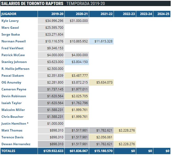En el verano que viene, jugadores tan importantes como Marc Gasol, Kyle Lowry, Serge Ibaka o Fred VanVleet eran agentes libres sin restricciones, mientras que la referencia para los próximos años, Pascal Siakam, será agente libre restringido, con lo que se espera que Masai Ujiri iguale cualquier oferta que presenten por él. Sin embargo, este clima de incertidumbre se ha aclarado un poco con la renovación de Kyle Lowry por una temporada más a cambio de 31 millones de dólares. De esta manera, los canadienses se aseguran hasta 2021 a un jugador clave en los últimos años, que sin duda será además un reclamo para la renovación de los miembros de la plantilla mencionados arriba.