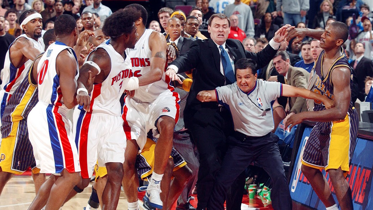 Otra de las grandes peleas en una cancha de baloncesto sucedió en noviembre de 2004 en un Indiana Pacers-Detroit Pistons en un evento que ha sido bautizado como "Malice at the Palace" ya que ocurrió en el Palace of Auburn Hills de Michigan. De este enfrentamiento salió la mayor sanción en cuanto a cantidad de partidos que la liga ha impuesto a un jugador en su historia. Cuando el partido se encontraba en sus últimos compases una discusión entre algunos jugadores provocó una tangana en la cancha que rápidamente se convirtió en una auténtica pelea. Cuando parecía que el asunto se había calmado y con un Ron Artest (más conocido ahora como Metta World Peace) tumbado en la mesa de anotadores, un fan tuvo la brillante idea de lanzarle un vaso de refresco, desatando la ira de un Artest cuya sangre nunca se ha parecido demasiado a la horchata. Inmediatamente el alero se dirigió hacia el aficionado y empezó lo que sería una batalla campal entre jugadores y aficionados en las gradas del Palace.
