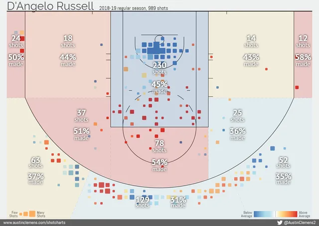 En esta carta de tiro por zonas -elaborada por austinclemens.com– vemos cómo Russell tiene un porcentaje muy mejorable en la zona restringida, pero es muy efectivo en el borde central de la zona, desde donde suele pararse para tirar tras bloqueo. La gran mayoría de sus triples, como se aprecia por el vacío de las esquinas, los lanza desde la zona frontal.