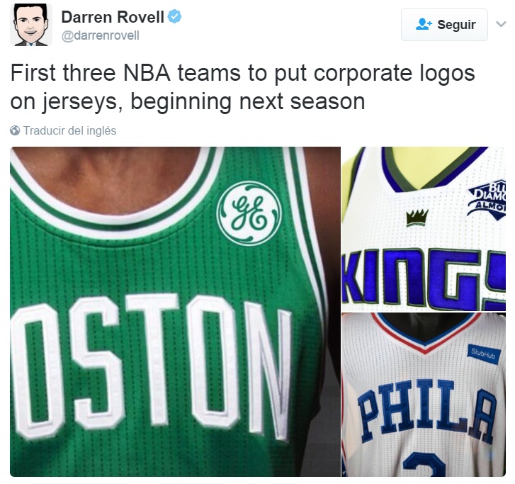 Darren Rovell, conocido reportero especializado en NBA de la cadena ESPN, hizo público recientemente en twitter los tres primeros equipos que sustituirán en sus uniformes el logo de la franquicia por un emblema publicitario, curiosamente son tres franquicias que han mantenido su seña de identidad de forma prolongada en el tiempo: Celtics, Sixers y Sacramento.