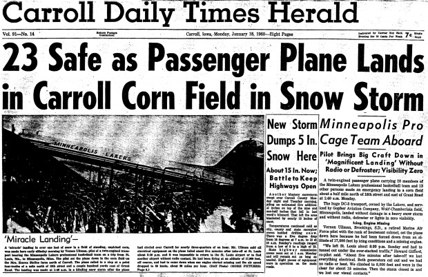 En cualquier caso, y predicciones macabras aparte, los Lakers terminaron montando en el avión. Era un viejo Douglas DC-3, modelo que había revolucionado el transporte aéreo de pasajeros en las décadas de los 30 y 40. Pese a su antiguedad, su morfología física y técnica resultaba ideal para trayectos de ese tipo. A los mandos del aparato se situaban el teniente coronel Vernon Ulman y el copiloto Harold Gifford. Una pareja con muchas horas de experiencia y que, por lo tanto, ofrecía sólidas garantías. Así pues, a las 20.30 de la noche despegaba el vuelo, con destino Minneapolis, del histórico aeropuerto Lambert-St.Louis International.