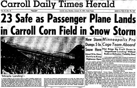 En algún punto de Iowa, el heróico Gifford propuso tratar de aterrizar en uno de los múltiples campos de maíces por los que estaba atravesando el DC-3. Así pues, trataron de encuadrar el avión en el punto de mira de los maizales, con la máquina tambaleándose y el temporal de nieve acechando de manera inconstante. Era invierno y la cosecha todavía no estaba crecida, con lo cual las posibilidades de establecer una improvisada pista de aterrizaje aumentaban.