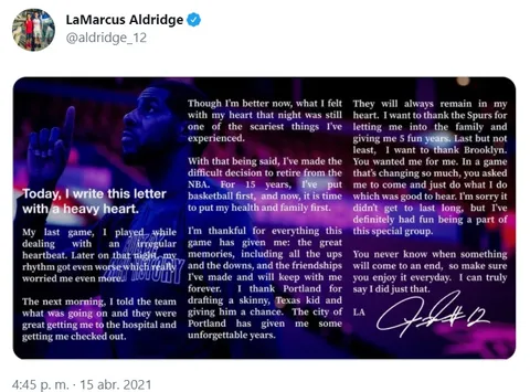 Una de las noticias que no nos gusta comunicar ha llegado recientemente, tras el anuncio del pívot de los Brooklyn Nets, LaMarcus Aldridge, donde comenta los problemas cardíacos que sufrió tras uno de sus últimos partidos, por lo que antepone su salud a su pasión.