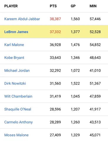 De todos modos, conforme pasan los partidos, LeBron se acerca más y más a un récord que ya parecía casi imposible de batir, por la longevidad y rendimiento que se debe mantener durante tanto tiempo. 1.055 puntos son los que le separan de los 38.387 puntos de Abdul-Jabbar para consagrar su carrera como una de las más exitosas que se recuerden. LeBron promedió la temporada pasada 30.3 puntos por partido. Si lograras mantener tal ritmo, el alero llegaría a la histórica cifra a mediados de esta temporada. Sin embargo, actualmente promedia 24.1 tantos y las lesiones no le han dejado jugar todos los partidos hasta ahora.