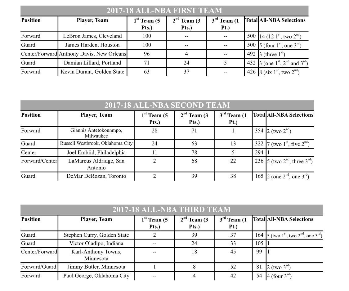 Quién no ha fallado ha sido un clásico de los premios. LeBron James suma su 12º presencia en el primer quinteto de la liga, mejor marca histórica superando los 11 de Kobe Bryant y Karl Malone. Además, LeBron y Harden son los únicos jugadores votados de forma unánime para el primer quinteto. Temporada de MVP de ambos.
