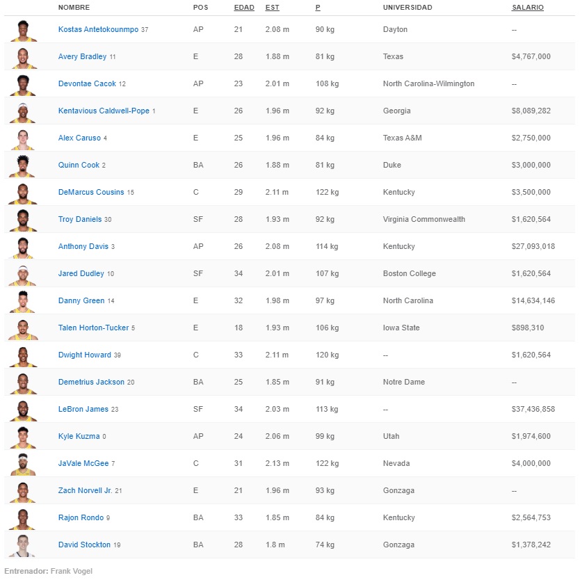 Les sigue el agente libre Danny Green (14.634.147 M.). Para los planes de Frank Vogel, son precisamente los tres jugadores clave de los Lakers en ambos lados de la pista. Green será la alternativa en los pick & roll entre LeBron y Davis, y se trata de uno de los mejores defensores de la liga. Salario algo elevado, pero acertada incorporación.