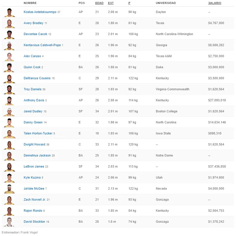 Como todos esperábamos, LeBron James (37.436.858 M.) y Anthony Davis (27.093.018 M.) son los jugadores con mejor salario de la plantilla de los Lakers. No es para menos, su condición de superestrellas de la NBA les llevan a tener los mejores contratos de la liga. La eterna duda: ¿renovará Davis con Lakers?