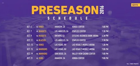 Inmersos en la planificación de la temporada que viene están también tanto los Lakers como los Jazz, protagonistas de las últimas novedades en la NBA. En el caso de la franquicia de California, la novedad trata sobre el comienzo de la temporada 2016/17. Ya han hecho oficial la pretemporada que seguirán durante el mes de octubre, la cual dará comienzo con un partido ante los Kings el día 4 de octubre en el Honda Center de Anaheim (California). Para poner el punto y final y dar comienzo a la Regular Season, los Lakers se medirán a los Suns en ese mismo pabellón el día 21 de octubre. Durante esos 17 días se enfrentarán, además de a los Kings y Suns, a los Warriors, Blazers y Nuggets.
