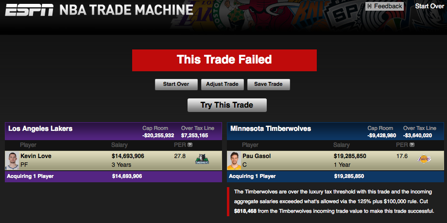 Pau, los Lakers deberían recibir sueldos por una cantidad aproximada entre 16 y 23 millones de dólares en 2013-14 para traspasarlo. Esto hace que muchos de los "rumores" que uno escucha no tengan sentido ni siquiera desde una perspectiva salarial. Una herrramienta fantástica (aunque con sus pegas) para ver si un traspaso tiene sentido a nivel salarial es la