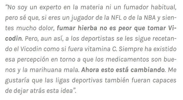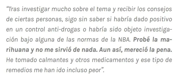 “Entre un 75 y un 80% de los jugadores de la NBA consumen marihuana”, reconocía el ex jugador Jay Williams hace unos años en una entrevista con Fox. Williams sabe de lo que habla. Drafteado por los Bulls en 2002 solo por detrás del número 1 Yao Ming, apenas pudo jugar una temporada en la NBA. En verano de 2003 tuvo un gravísimo accidente de moto, en la que se fracturó la pelvis y los ligamentos de la rodilla. Los médicos llegaron a plantearse amputarle la pierna.