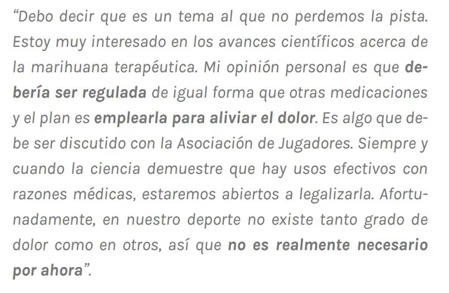 No obstante, el comisionado de la NBA, Adam Silver, reconoció en la entrevista anual que el jugador de los Blazers CJ McCollum (graduado en periodismo en la Universidad de LeHigh) le realiza anualmente que no cree que haya “necesidad de cambiar nada ahora mismo”. “En algunos Estados es legal, pero nuestros jugadores viajan constantemente y sería casi una trampa: es legal en unos Estados, pero en otros no lo es. Y en ese sentido sería un problema viajar con marihuana también, claro”.