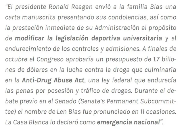 ¿Y qué pinta la NBA en todo este percal más allá de los reglamentos internos? En 1986 Len Bias moría solo dos días después de ser elegido con el pick número 2 por los Boston Celtics de una sobredosis. Su muerte sería el impulso mediático y político definitivo para recrudecer la campaña. Como escribía Gonzalo Vázquez en su serial de artículos La última noche de Len Bias: