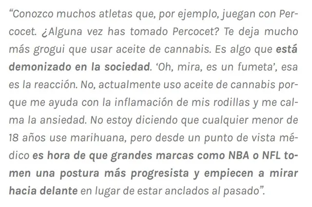Y no son los únicos. Blake Griffin, entre tantos otros, también defendió su utilidad terapéutica hace unos años y Karl Anthony Towns declaró esta misma semana que coincidía con Stern sobre la despenalización de la marihuana en una entrevista con ESPN.