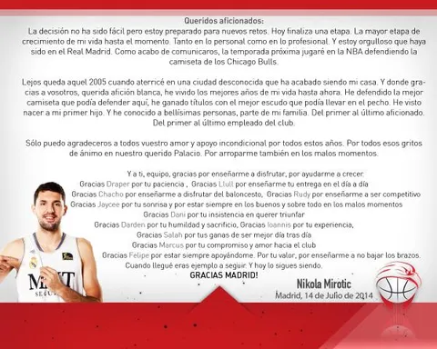 Poco tiempo después, el propio Nikola Mirotic hacía pública esta nota de agradecimiento en el que, por cierto, se omite el nombre de Pablo Laso.