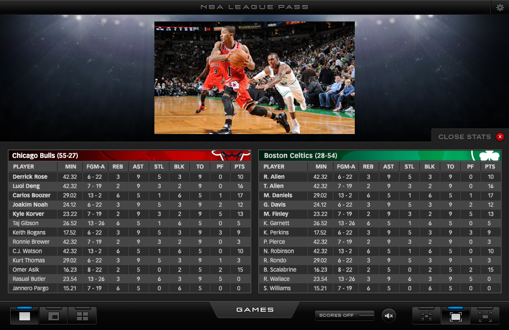 Una vez dado suscrito al NBA League Pass, podrás elegir ver los partidos que se emiten cada jornada en un magnífico HD y glosados con todo tipo de estadísticas en tiempo real. La coincidencia de partidos no será un obstáculo, ya que podremos partir la pantalla hasta en cuatro ventanas para poder seguir al unísono otros tantos encuentros que se estén emitiendo en directo.
