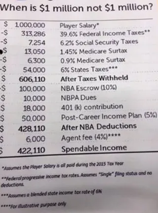 *5%-50.000$ Post-Career Income Plan: Desde hace algunos años, se obliga a los jugadores NBA a pagar un 5% de sus sueldos para un fondo para hacer frente a la vida tras dejar el baloncesto. Los inumerables casos de jugadores multimillonarios que han acabado en la ruina han llevado a la NBA a tomar tal decisión.