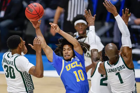 El último encuentro de estos First Four era el gran encuentro de la ronda, un choque que parecería más una final ya que enfrentaba a dos de las históricas universidades: UCLA y Michigan State. El partido empezaba con igualdad entre ambos conjuntos gracias a las aportaciones del mexicano Jaime Jaquez (27 puntos y 4 rebotes) por lado Bruin y de Aaron Henry (16 puntos y 7 asistencias) por lado Spartan. Pero los de East Lansing pronto conseguían abrir hueco en el marcador y se escapaban por 11 puntos al descanso, 44-33. Tras el paso por vestuarios, los de Los Angeles volvían más entonados y con Tyger Campbell y Jules Bernard empezando a reaccionar y un Johnny Juzang que entraba en trance anotador, conseguían igualar el encuentro y llevar el partido a la prórroga, siendo en el tiempo extra muy superior el conjunto angelino que aseguraba su pase a la primera ronda para encontrarse a Brigham Young.
