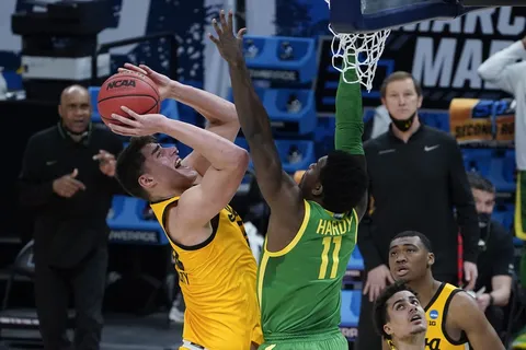 En el primer partido de los disputados en esta región el favorito número 2, Iowa se vio superado, a pesar de la gran aportación de su estrella Luka Garza (36 puntos y 9 rebotes), por la buena de los exteriores de Oregon, Will Richardson (19 puntos, 6 rebotes y 7 asistencias), Chris Duarte (23 puntos y 7 asistencias) y LJ Figueroa (21 puntos y 7 rebotes), que con su acierto desde más allá del arco dinamitaron las opciones de Final Four del mejor equipo de los Hawkeyes en mucho tiempo y vencieron por 95-80.
